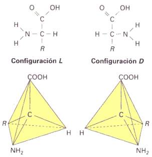 Los aminoácidos presentan isomería, ya que poseen un carbono asimético (carbono α), unido a cuatro radicales distintos (excepto en el caso de la glicina).