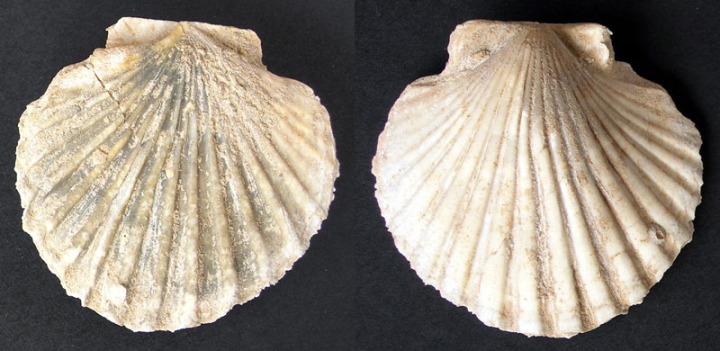 Ejemplar de Pecten sp. Bivalvo equilateral e inequivalvo (valva izquierda plana y derecha abombada), con ornamentación en base a costillas radiales. Del Mioceno superior de Carrascoy