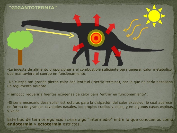Fisiología animal : La gigantotermia u homeotermia inercial es un fenómeno de importancia en la biología y la paleontología por el cual los animales de sangre fría de voluminoso tamaño tienen mayor facilidad de poder mantener una temperatura constante, en virtud de una mayor relaciónvolumen/superficie.La lógica detrás del funcionamiento de la gigantotermia es simple: un animal grande tiene proporcionalmente menos superficie de su cuerpo en contacto con el exterior, siendo la mayor parte de su masa la que se encuentra en su interior sin contacto externo —como los tejidos, órganos, sangre—, a diferencia de los animales más pequeños que tienen la mayoría de sus áreas del cuerpo en contacto con el exterior. Por ello, las ganancias o pérdidas de calor en el ambiente suceden más lentamente.2
