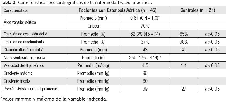 La patología valvular aórtica en la muestra de interés fue documentada, como crítica en 70% de los pacientes y grave en 30% restante. La fracción de expulsión del ventrículo izquierdo promedio fue de 62% en los pacientes con EAo, de los 45 pacientes, en 39 se documentó una FEVI >50%, y seis pacientes con FEVI entre 45% y 50%. Ninguno con disfunción sistólica grave ni dilatación de cavidad ventricular izquierda (Tabla 2).