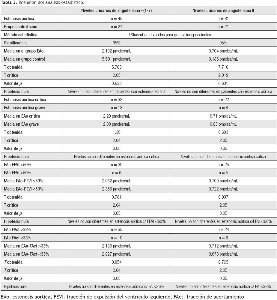 El grupo control conservó una distribución esperada dentro del rango normal de las determinaciones de niveles urinarios de Ang–II y Ang–(1–7). En el grupo de pacientes con estenosis aórtica se determinó claramente un alza en la concentración de niveles urinarios de angiotensina II (medias: 0.704 vs. 0.185 pmoles/mL) así como una concentración urinaria de Ang–(1–7) menor al límite inferior considerado como normal (medias: 2.102 vs.5.591 pmoles/mL)