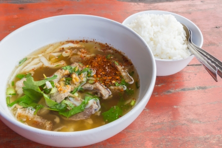 La sopa de vísceras de cerdo es una sopa malaya y singapuresa originaria deChaozhou (China. Es una sopa clara y refrescante, por lo que a veces se denominacheng terng (清湯) y sirve con otros acompañamientos opcionales además de con arroz. Consiste en una mezcla de vísceras de cerdo cocida: hígado, corazón, intestinos,estómago, lengua, sangre en dados, recortes, tiras de verdura en salazón, algo delechuga china y una pizca de hojas de cebolla picadas y pimienta.1 2 A veces se acompaña con hojaldres de tofu braseados, huevos y verduras en salazón. La comida suele servirse con una salsa picante especial o con salsa de soja con guindilla picada.
