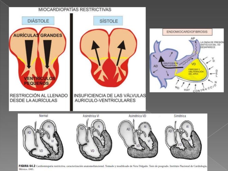 La miocardiopatia restrictiva pertenece a un pequeño grupo de Miocardiopatías que se caracterizan por alteraciones en el lleno diastólico por disminución de la distensibilidad, por enfermedades propias del músculo cardiaco como en la miocardiopatía restrictiva idiopática, por infiltrado como en la amiloidosis y almacenamiento como se puede ver en la enfermedad de Fabry, hemocromatosis, etc. Puede afectar tanto en ventrículo izquierdo como derecho. El aumento brusco de presión como respuesta a pequeños ingresos de volumen en los ventrículos da lugar a los signos y síntomas típicos de esta patología y a la presencia de congestión tanto venosa como sistémica.