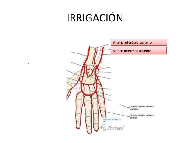 - Se ramifica en la arteria interósea recurrente.1