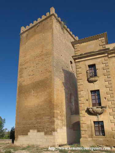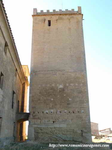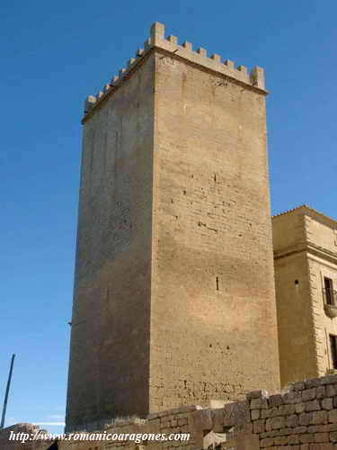 La torre tiene unos siete metros de lado y alrededor de 20 de altura. En la actualidad se halla junto al ángulo suroeste del palacio barroco del XVIII que fuera del Conde de Aranda y Vizconde de Biota (Imagen 6). Su aspecto es extremadamente sencillo. Adusto. Militar en suma. Al exterior se adivina una distribución en cuatro niveles. El inferior sería de almacén. En el primer piso la puerta de acceso, situada en el lienzo este y que en la actualidad se ha transformado, ampliándola, en comunicación hacia el palacio del Vizconde de Biota mediante paso elevado (Imagen 5). Sobre ella, en la segunda planta hay otro vano de medio punto, probablemente de cadalso para defender la puerta bajo el mismo.Y poco más, vanos aspillerados, muy sencillos y buena sillería con abundantes marcas de cantería en las que se repiten tres símbolos: una "N", otra a base de tres trazos en angulo recto, y la repetida marca a base de una línea en uno de los ángulos del sillar.
