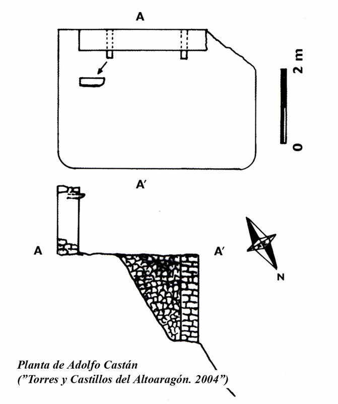 El castillo fue poco menos que una torre de vigilancia. Sus escasos 11 metros cuadrados apenas debían proporcionar espacio para una mínima guarnición, sin que haya terreno llano en su entorno que permitiera el más mínimo recinto murado. Los muros miden 0,56 m de espesor, y según Castán son los más estrechos de los castillos inventariados.La hechura es de mampostería aglutinada con argamasa. Tuvo al menos dos plantas, pues quedan en el lienzo sur un par de ménsulas para sustento de una solera de madera así como un escalón en su muro interior.