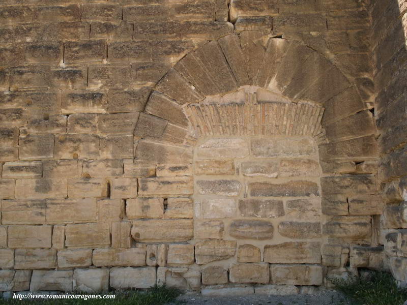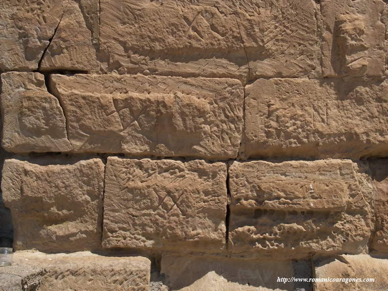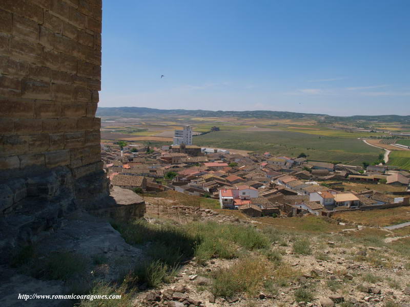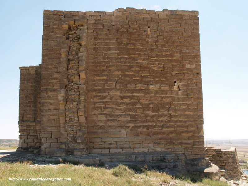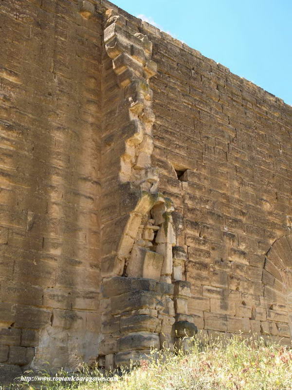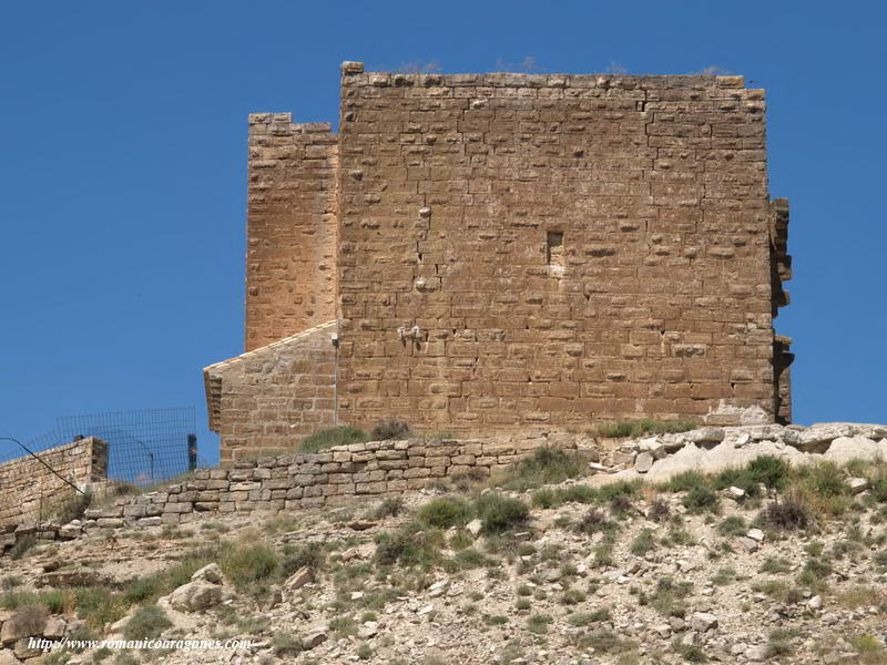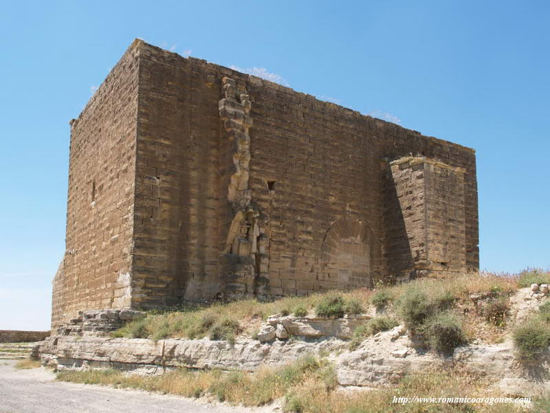 http://www.romanicoaragones.comTanto Aurelio Cabañas en su obra de 1999 sobre los castillos aragoneses y editada por el Periódico de Aragón, como Cristobal Guitart en el volumen I de su tratado sobre los mismos castillos coinciden en afirmar que hay dudas documentales por cuanto hay varios Castejones en Huesca (De Sobrarbe, del Puente, de Valdejasa). Aparece en las citas históricas de 1168 un tenente: Pedro de Alcalá; pero no es seguro que sea este el lugar de su tenencia. Para Agustín Ubieto la fecha más antigua referida al mismo se remontaría a 1211.El castillo de bella estampa corona un cerro amesetado al norte de Castejón de Monegros y su primitiva función debió de ser defensa del reino y cabeza de puente en las extremaduras con los moros de Fraga y su entorno.Se puede acceder desde Zaragoza, por la autopista hacia Lérida, saliendo en Bujaraloz y continuando carretera hacia Sariñena en dirección norte. También, la vía inversa: Huesca-Sariñena-Castejón, según el lugar donde nos hallemos.El castillo actual no es sino una sala del primitivo edificio. Los arranques de los muros perimetrales del recinto lo confirman (Imágenes 7 y 9). Tiene forma de rectángulo con su eje mayor en dirección este-oeste y mide unos 20 x 12 m en planta por otros 10 en alzado. Al interior la estancia se halla cubierta por bóveda de medio cañón apuntado, con un pequeño ventanal aspillerado hacia el sol naciente. Hay otro ventanal adintelado en el muro sur, hacia levante de la primera de las torres. Tampoco sería descabellado pensar que hubiera sido la sobria capilla cisterciense del recinto, dada su orientación.Hoy se aloja en él la ermita dedicada a los Santos Fabián y Sebastián, de hechura tardía y con poco interés para la época que nos ocupa.El lado sur del edificio está guarnecido por dos torrecillas gemelas de sección cuadrada que destacan rotundamente del muro (Imágenes 1 y 2). Hay otra similar en el muro norte, a poniente de la portada cegada del mismo (Imagen 7).Es en el lado norte donde se hallan los elementos de mayor interés. esta zona se hallaba casi en su totalidad intramuros del recinto. Junto a la torre descrita, una portada de medio punto dovelada hoy tapiada, permitía el acceso desde el recinto amurallado(Imágenes 5 y 7).Hacia el extremo oriental de este muro, queda el arranque del lienzo este del recinto. Conserva el inicio de una portada dovelada que permitiría el acceso al patio de armas, y sobre ella, en altura, la ménsula oeste de un desaparecido matacán (Imágenes 6 y 8).El arranque del muro perimetral hacia poniente, se aprecia en la imagen 9.Una característica diferencial de este castillo, dada la zona en que se halla, es su construcción en piedra sillar caliza cuidadosamente elaborada, con abundante almohadillado. Este detalle la da una sensación de "rugosidad" a los muros (Imágenes 1 y 2). La mayor parte de los sillares lucen marcas de cantero, grandes y bien elaboradas (Imagen 10).La presencia en los sillares a partir de la hilada quince o dieciséis de un pequeño trépano casi centrado cercano a su borde superior, nos habla de la mecanización de su construcción, empleando grúa y compás para aprisionar e izar los bloques. Técnica esta ya utilizada desde antiguo por los romanos.