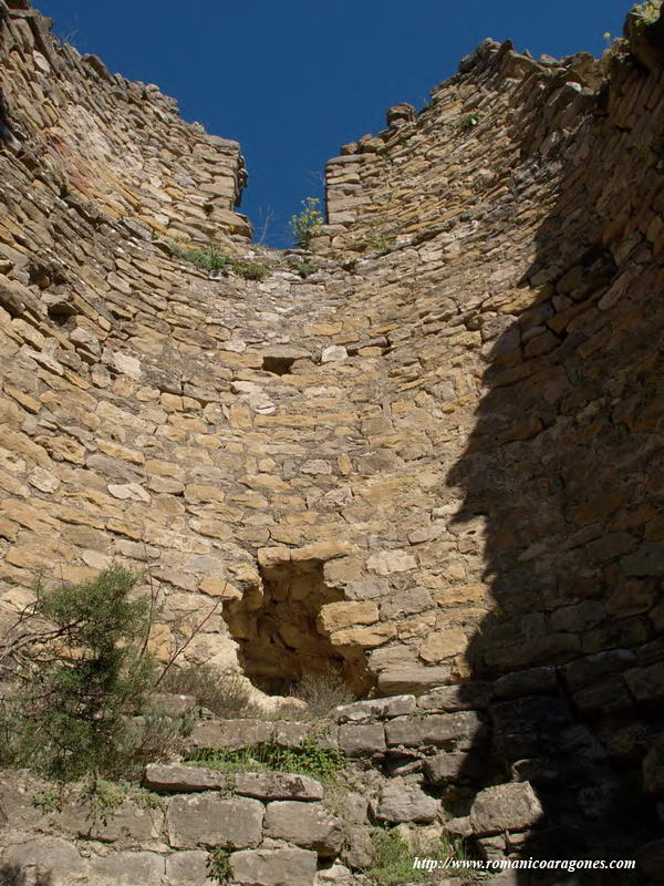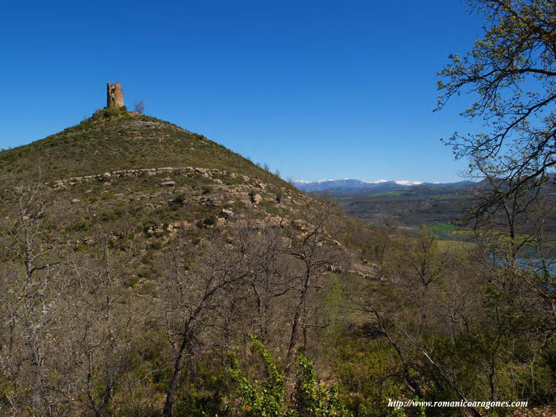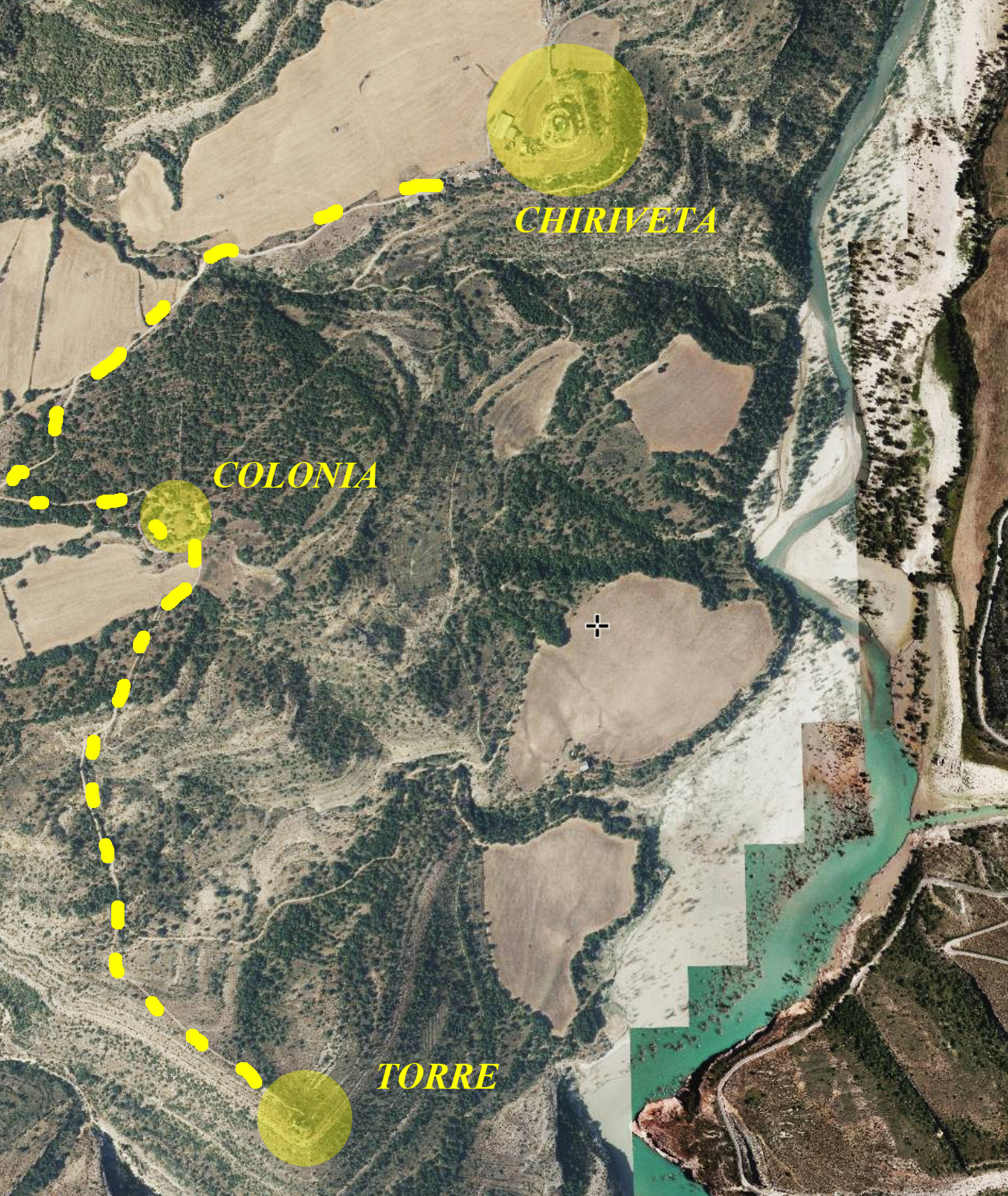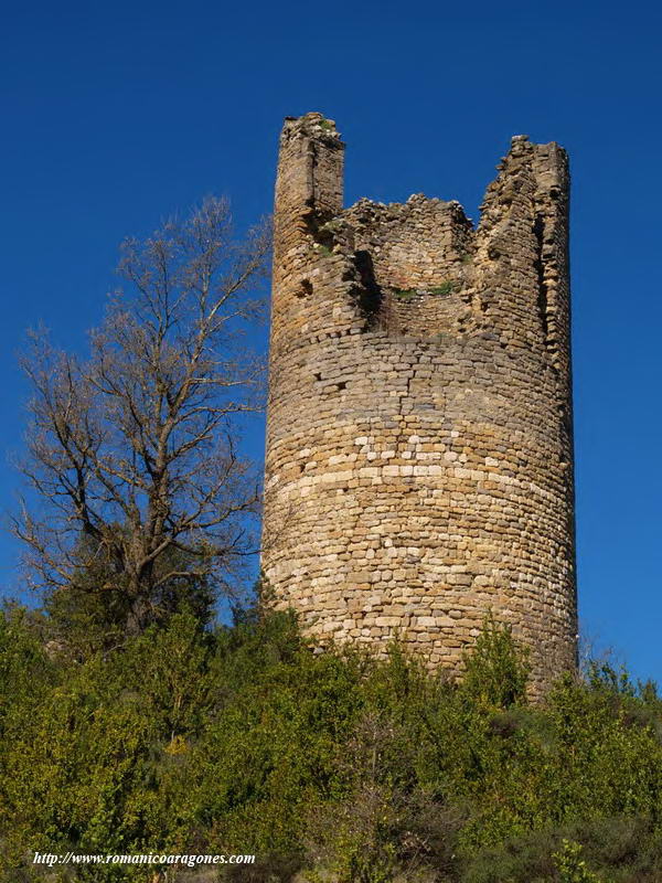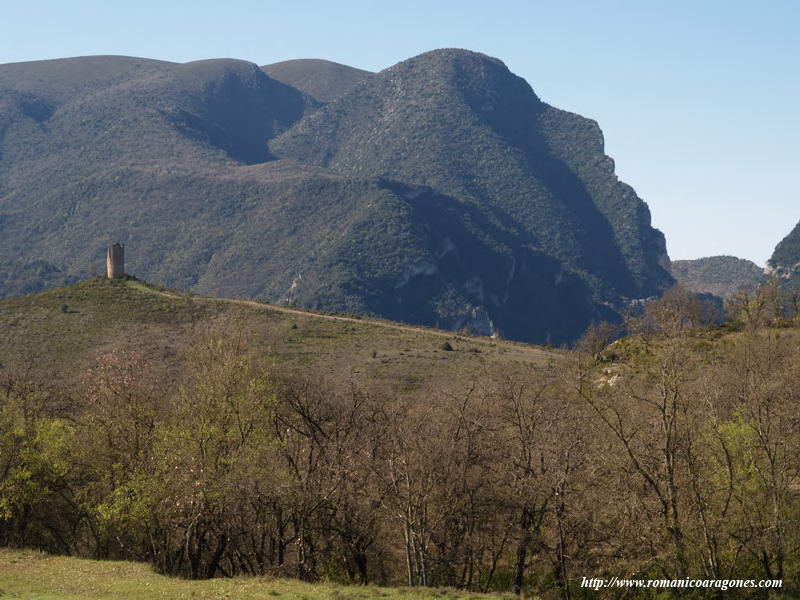 Circulando por la carretera N-230, desde Benabarre hacia Montañana, rebasado el desvío de Litera, hacia el kilómetro 87, hay a nuestra derecha una pequeña zona de descanso. Justo rebasada esta, sale una pista a nuestra derecha, en descenso, que no se ve desde la carretera. Vadea el barranco de la Valfuera, de menguado caudal, y en tres kilómetros nos sitúa en el semiabandonado pueblo de Chiriveta. Desde allí, pista hacia el suroeste, que en un cercano bosquecillo gira a sureste para llegar al caserío de "El Mas" donde hay colonia veraniega (Ver Plano 1). Ya a estas alturas estamos viendo todo el tiempo la torre, con el telón de fondo de las sierras de Mongay y Montsec, reunidas o separadas -según talantes- por el congosto de Montrebey/Mont-Rebei (Imagen 4). Desde allí a la torre apenas hay un kilómetro de pista aceptable.La torre corona un otero, vigilante otrora de los caminos que seguían la ruta del río Noguera Ribagorzana. Edificada a partir de 1061 en terrenos ya conquistados, al igual que Falcés, Luzás, Viacamp, Torreciudad y la torre de Pano.Es quizás la más tardía de todas, siendo datada hacia 1070 (Esteban Lorente, Galtier Martí y García Guatas: El Nacimiento del Arte Románico en Aragón. 1982. pp.: 91).Quizá por ello su puerta de acceso se sitúa en un plano bajo, sobre macizo basamento. Su misión ya no es defensiva, para soportar asedios; sino de vigilancia de las nuevas tierras conquistadas.Es torre cilíndrica, edificada sobre base maciza. Carece de recinto circundante y se alza 15 metros sobre el terreno. Sus muros alcanzan los 2,15 m de espesor, y el vano de la puerta, de los más amplios, mide 0,95 m. Al exterior está construida en sillarejo. Hiladas y sillarejos sueltos de tono más claro, rompen su monotonía constructiva.Al interior, el sillarejo solo tapiza la planta baja. Desde el primer retranqueo hacia arriba, es mampostería lo que vemos al interior (Imagen 8). La puerta, como ya se ha dicho, abre al sur, en la planta baja (Imagen 7). Quedan parte de sus jambas y el arranque del medio cañón de su zaguán. Otro retranqueo más arriba nos indica que debió de organizarse en tres plantas divididas por dos soleras de madera. Tuvo vanos aspillerados en la planta intermedia y varios vanos -cinco dice Aramendía- cubiertos de medio cañón con jambas salientes en lo que apoyar los postigos de madera (Imágenes 8 y 9). No hay mechinales de caldalso al exterior.El estado de la torre es preocupante: una gruesa grieta recorre su muro sur desde la portada hacia lo alto, manteniéndose en precario equilibrio parte de su estructura. Junto con otra grieta en el lado opuesto (Imagen 1) dividen el cilindro en dos mitades. Me viene a la memoria la torre de Montañana y su agonía... Consolidar la estructura de este referente visual para la turística zona de Montrebey beneficiaría a dos Comunidades y mantendría este retazo de nuestra historia.10Tras visitar la torre, es obligado acercarse a lo que fue en origen la iglesia castrense de Nuestra Señora del Congost (Imagen 10). No hay senda reconocible desde la torre. Hay que guiarse por el GPS o por la intuición para encaminarse a ella, pues hasta que no se llega a la misma, no se ve. Puede servir de ayuda la foto aérea que acompaño (Ver Plano 2). Sin ser un gran esfuerzo, si que requiere de interés por visitarla, no tener prisa y una aceptable forma física. Las vistas nos compensan con creces.