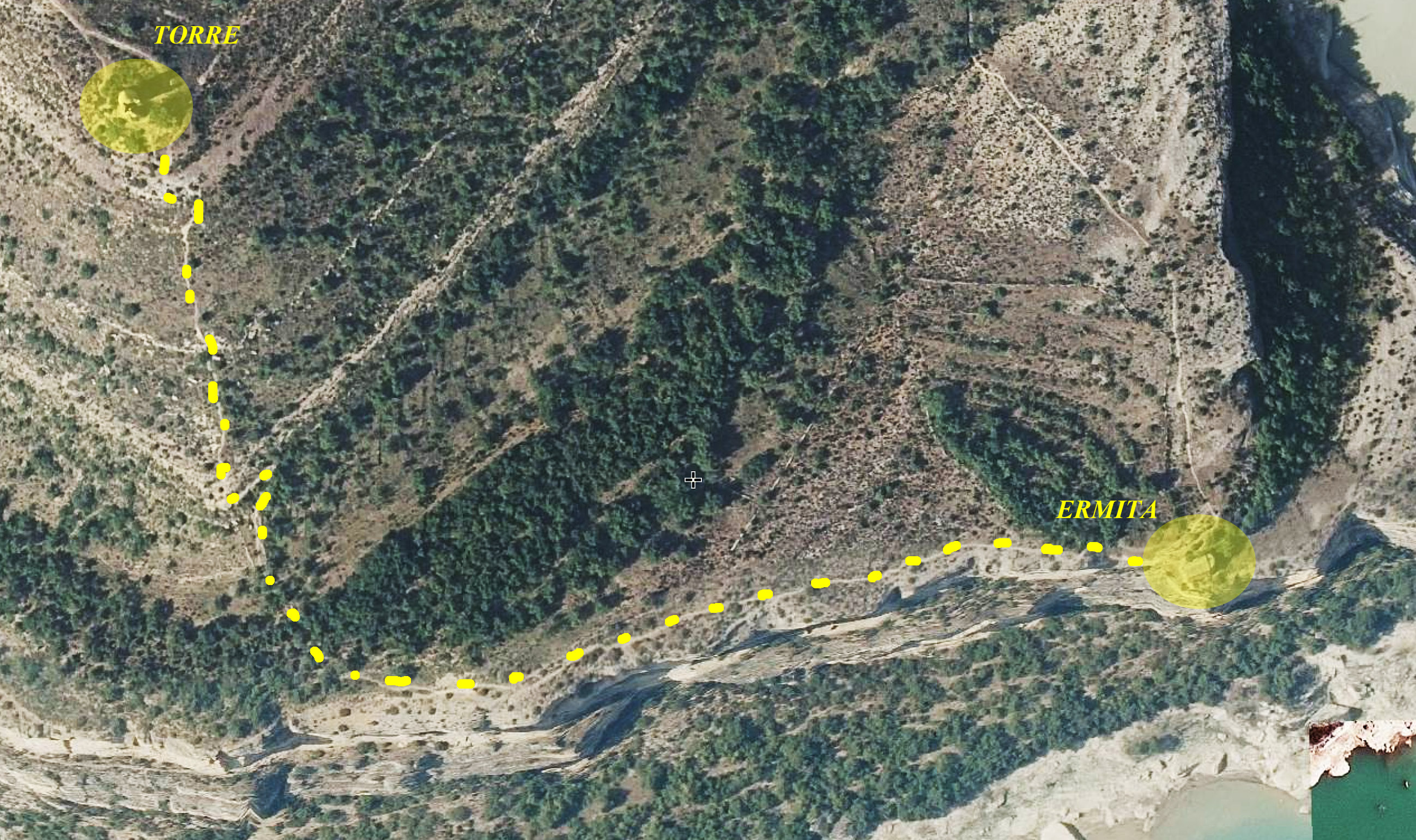 No lejos de la ermita, a una cota más baja y cerca del depósito de agua, se observan lo que pudieran ser los restos de una torre vigía.