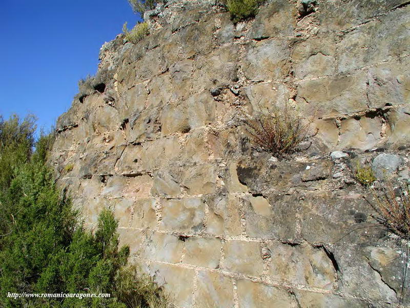 Berdejo es tierra de frontera. Es una de las extremaduras del viejo reino. Próxima a tierras sorianas de Castilla y por tanto, defendidos sus pasos naturales con castillos y atalayas en altura.Y la cuenca del río Manubles es un paso natural de primer orden. Sus serpenteantes recodos han labrado cortadas y paredones de gran belleza.Mucho antes de llegar a Berdejo, ya sabemos de su proximidad por la altiva figura -todavía- de su castillo. El caserío se extiende en ladera a su lado sur y llega hasta el río.Y como no podía ser menos, la iglesia castrense de San Millán se yergue sobre un peñasco de vertiginosa cortada sobre la carretera y el río (Imágenes 3 y 5). Fácil de defender en caso de apuro.De la iglesia románica original, queda poco; pero lo que aguanta nos hace suponer su imponente aspecto. Cabecera y presbiterio es lo que resta de su fábrica de finales del XII o principios del XIII. Con el paso del tiempo, las reformas desvirtuaron su aspecto original. Buena parte de lo que ahora vemos es del XVII.Cuatro semicolumnas adosadas al cilindro absidal lo segmentan en cinco lienzos. Hubo ventanal centrando el medial; pero actualmente está cegado (Imagen 5). Las semicolumas acaban en sencillos capiteles que contribuyen a sustentar la cornisa junto a canecillos de perfil liso. A pesar de su evidente deterioro, la visión frontal del ábside en su espectacular situación, sigue siendo imponente.5En las fechas que visité el templo (11-7-2006) está siendo sometido a obras de rehabilitación. De nuevo se puede ver una cimbra en su interior, preparada para cumplir su misión (Imágenes 6 y 7). La nave se compone de cuatro tramos divididos por tres fajones apuntados que en algunos tramos son de ladrillo. Por encima de los mismos se ha montado una cubierta metálica. Y en el piso, cemento generosamente extendido hasta los mismos paramentos verticales. Habrá que ver qué ocurre con la dilatación del mismo por el calor. En San Gil de Luna están sufriendo el mismo problema, a pesar de haber lo previsto e incluido una junta de dilatación.Andamios, sillares, material de obra... De nuevo un templo en marcha. Nunca se acaban las obras definitivamente. La imagen 10 muestra el interior del cilindro absidal, y sobre él, la bóveda de escayola con decoración geométrica. Ignoro si la original estará tras ella (Imágenes 10 y 11).Y allá en lo alto, al norte del templo, el castillo con su planta pentagonal, de ángulo orientado al este y cerrado por un elevado torreón. Su mayor diámetro (este-oeste) es de 37 metros, y a lo ancho mide20, siendo su área de 640 metros cuadrados. La fábrica es mayoritariamente de mampostería trabada con mortero, salvo en las zonas sensibles de su estructura como son las esquinas, donde aparecen buenos sillares. También es de sillares la totalidad del lienzo este de la citada torre (Imagen 13), en cuya base advertimos una portada de medio punto dovelado.13Asentado directamente sobre la roca, todo su perímetro, a excepción del lado este, es fácilmente defendible (Imágenes 13 y 16) siendo allí donde se elevó la torre mencionada (Imagen 15). Cronológicamente debe de corresponder a un momento avanzado del siglo XIII. Hay constancia documental de que fue fortificado por Pedro IV de Aragón en 1357, según cita Aramendía.Muy poco antes de llegar al pueblo, al lado derecho de la carretera, hay un puentecillo de un solo ojo. Es de arco de medi punto, con perfil de lomo de asno rebajado. Edificado en buena piedra sillar como la vista en el templo, debe de ser coetáneo del mismo, al servicio de las vías de comunicación de la zona.