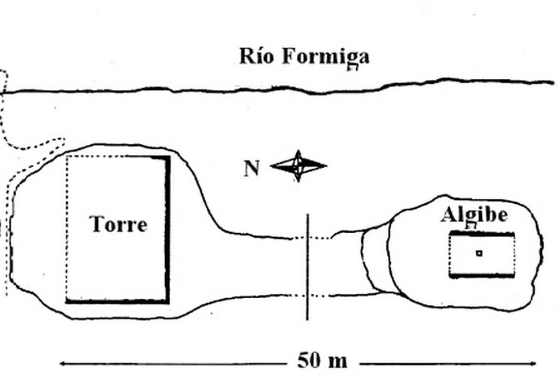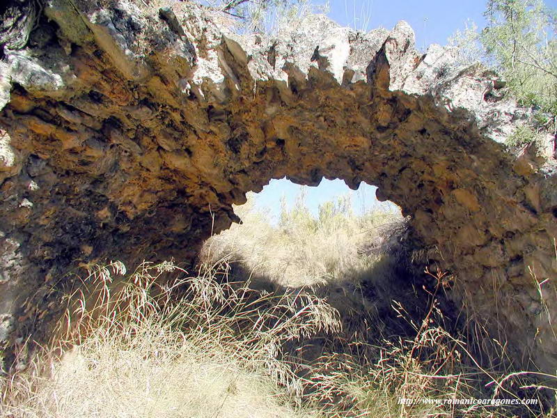 Una vez en lo alto se observan las ruinas de lo que fue una torre cuadrangular de la que solo queda el arranque de dos de sus lienzos (Imágenes 2 a 4); y unos metros más al sur, las ruinas de un aljibe cubierto con bóveda de medio cañón y oquedad en lo más alto para recoger agua de lluvia.(Imágenes 5 a 7). Le faltan los muros de cierre sur y norte; lo que le da aspecto de puente o túnel.