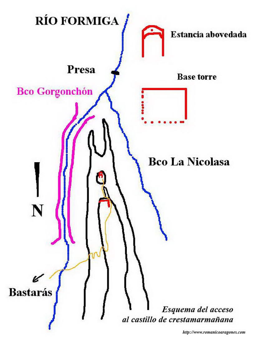 Conocí de la existencia de los exiguos restos del castillo de cresta Marmañana, en Bastarás por mi compañero de trabajo en el Hospital San Jorge de Huesca, Chema Coiduras. Juntos hicimos el corto; pero agreste recorrido que conduce a sus exiguas ruinas.